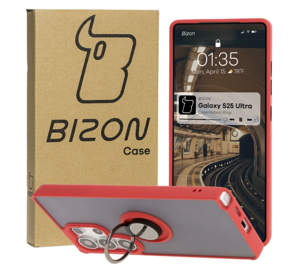 Etui Bizon z uchwytem na palec Hybrid Ring do Galaxy S25 Ultra Przydymione z czerwoną ramką