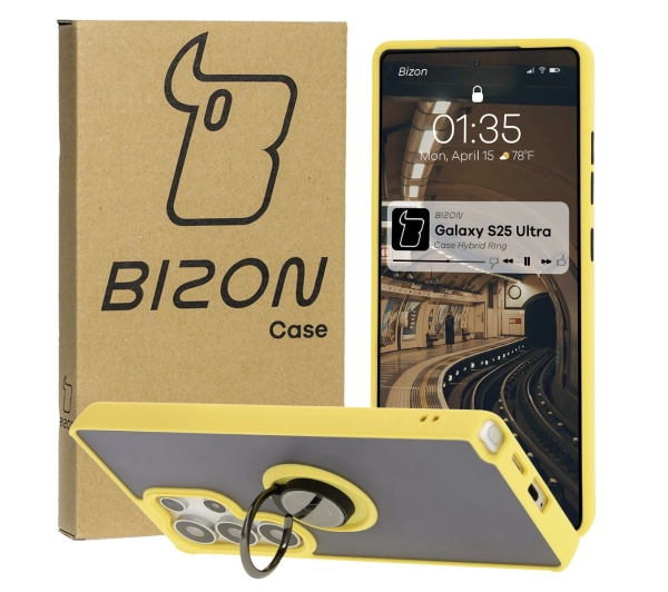Etui Bizon z uchwytem na palec Hybrid Ring do Galaxy S25 Ultra Przydymione z żółtą ramką