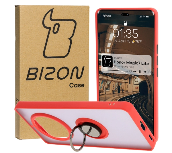 Etui Bizon z uchwytem na palec Hybrid Ring do Honor Magic7 Lite Przydymione z czerwoną ramką