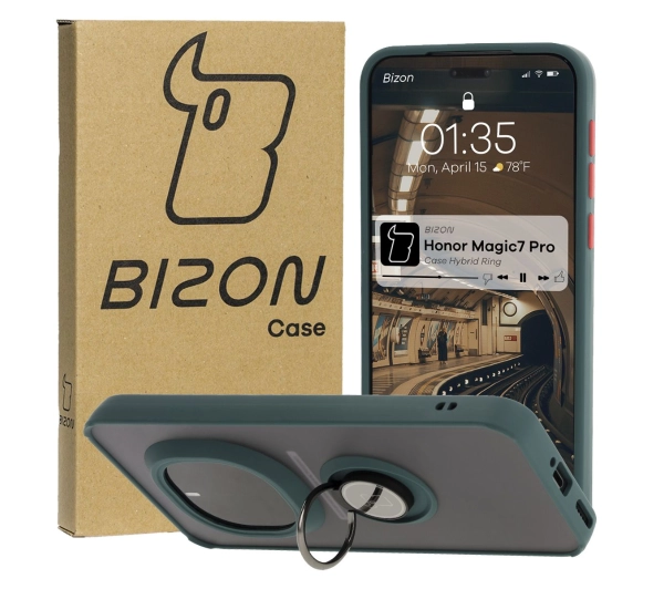 Etui Bizon z uchwytem na palec Hybrid Ring do Honor Magic7 Pro Przydymione z ciemnozieloną ramką