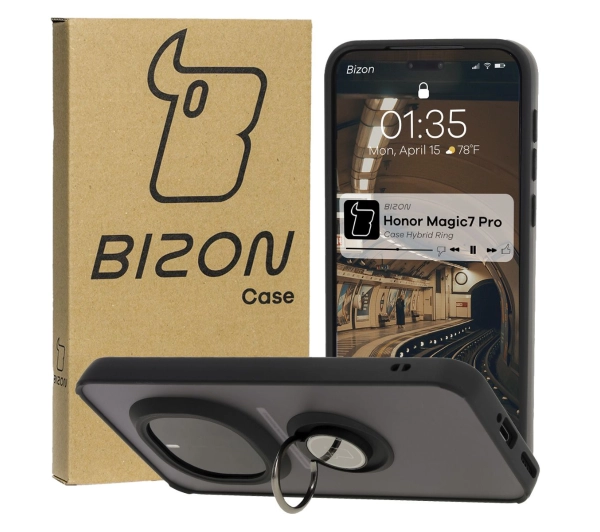 Etui Bizon z uchwytem na palec Hybrid Ring do Honor Magic7 Pro Przydymione z czarną ramką