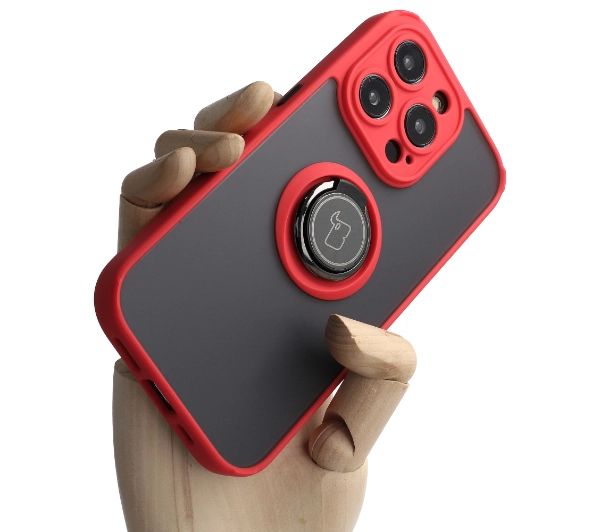 Etui Bizon z uchwytem na palec Hybrid Ring do iPhone 14 Pro Przydymione z czerwoną ramką