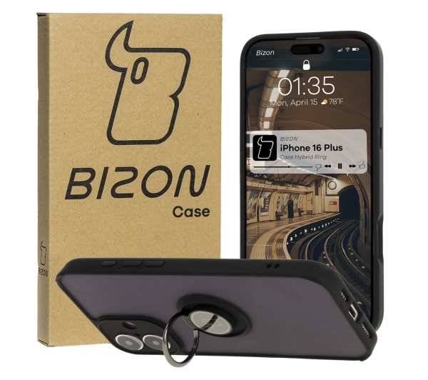 Etui Bizon z uchwytem na palec Hybrid Ring do iPhone 16 Plus Przydymione z czarną ramką