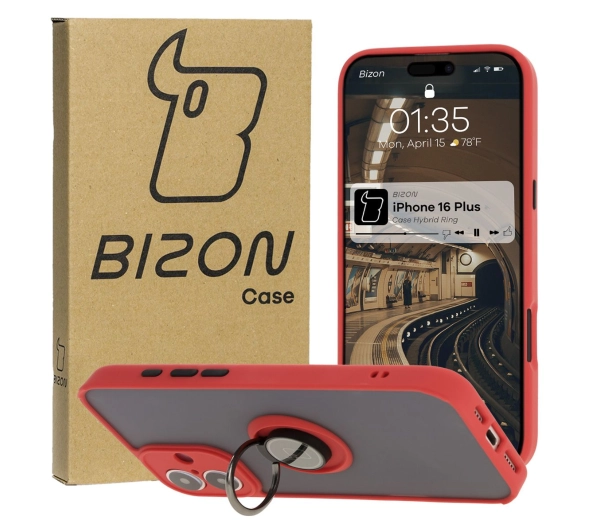 Etui Bizon z uchwytem na palec Hybrid Ring do iPhone 16 Plus przydymione z Czerwoną ramką