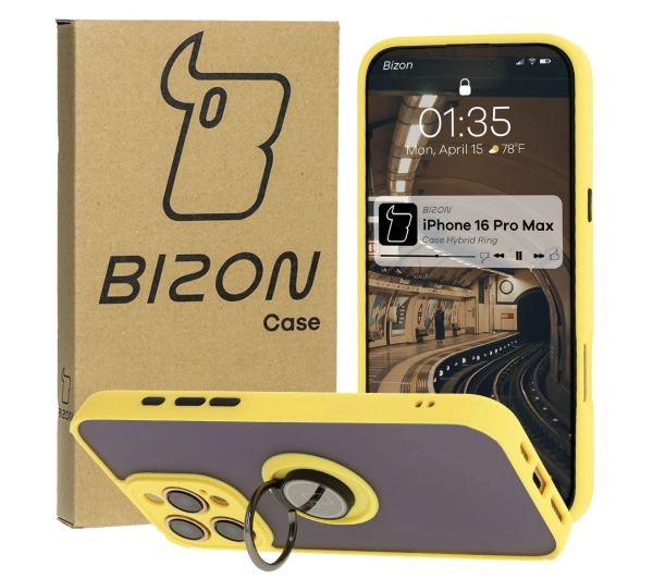 Etui Bizon z uchwytem na palec Hybrid Ring do iPhone 16 Pro Max przydymione z Żółtą ramką