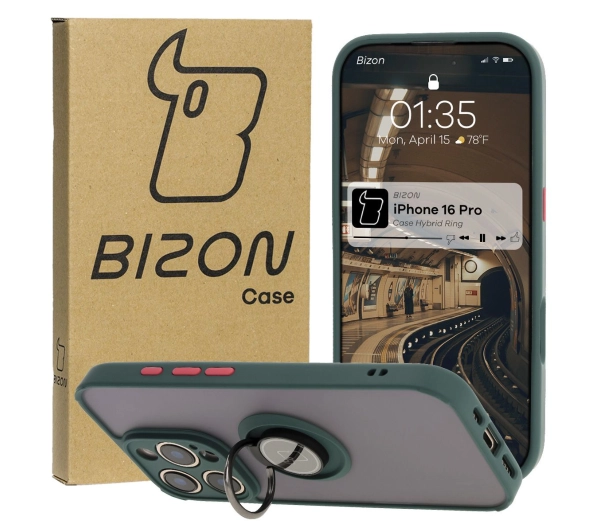 Etui Bizon z uchwytem na palec Hybrid Ring do iPhone 16 Pro Przydymione z ciemnozieloną ramką
