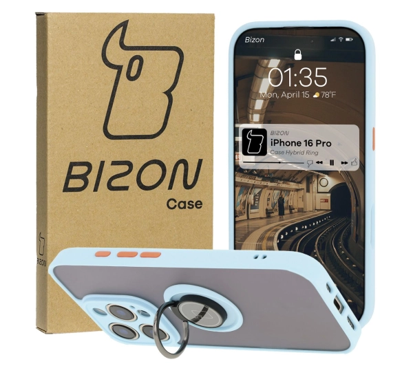 Etui Bizon z uchwytem na palec Hybrid Ring do iPhone 16 Pro przydymione z Jasnoniebieską ramką