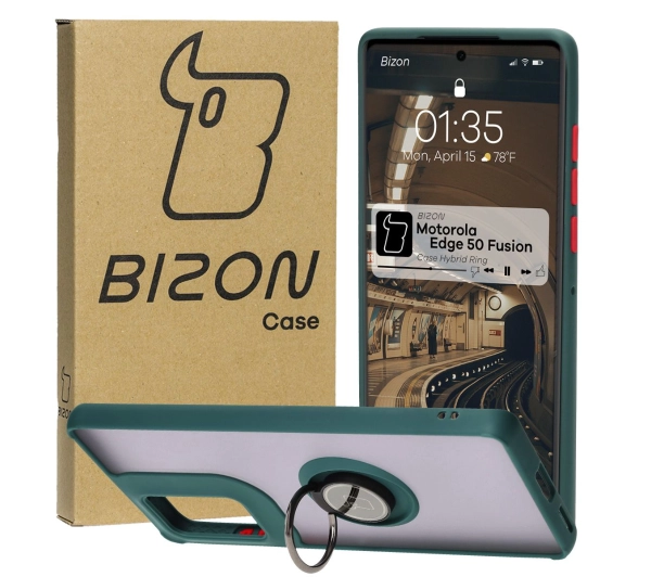 Etui Bizon z uchwytem na palec Hybrid Ring do Motorola Edge 50 Fusion przydymione z Ciemnozieloną ramką