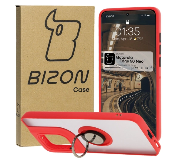 Etui Bizon z uchwytem na palec Hybrid Ring do Motorola Edge 50 Neo Przydymione z czerwoną ramką