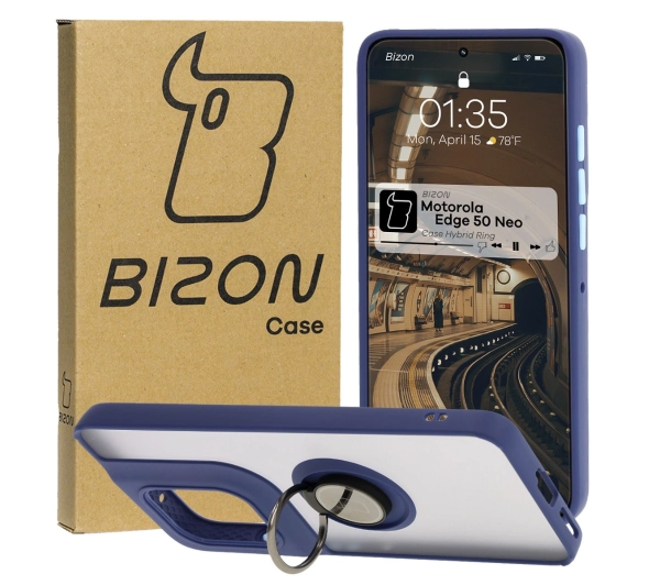 Etui Bizon z uchwytem na palec Hybrid Ring do Motorola Edge 50 Neo Przydymione z granatową ramką
