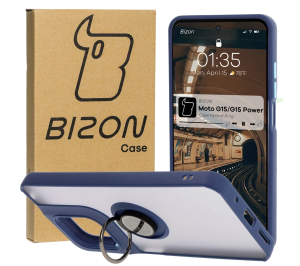 Etui Bizon z uchwytem na palec Hybrid Ring do Motorola Moto G15 / G15 Power Przydymione z granatową ramką