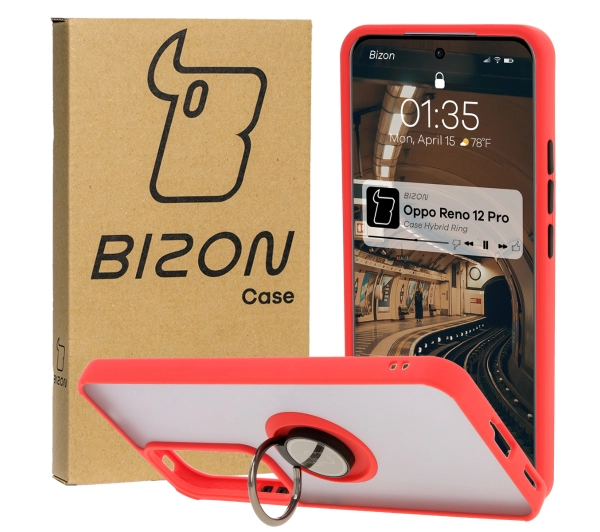 Etui Bizon z uchwytem na palec Hybrid Ring do Oppo Reno 12 Pro przydymione z Czerwoną ramką