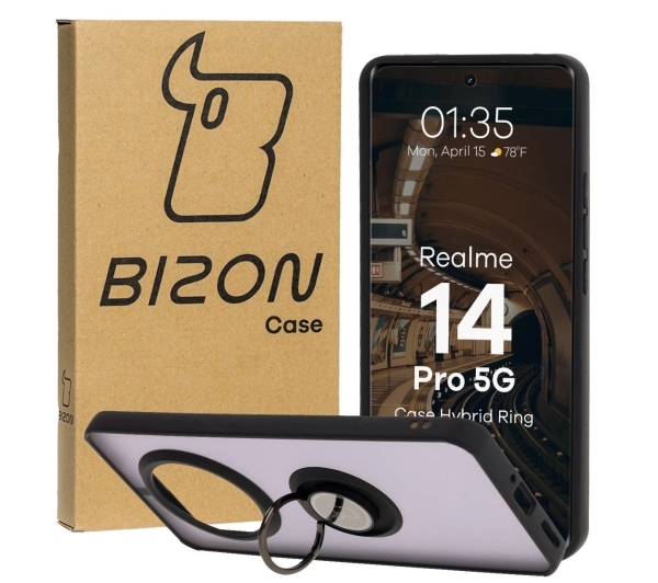 Etui Bizon z uchwytem na palec Hybrid Ring do Realme 14 Pro 5G przydymione z Czarną ramką