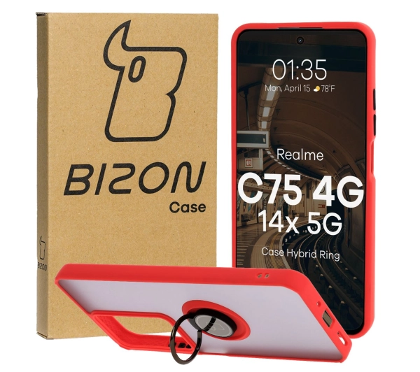 Etui Bizon z uchwytem na palec Hybrid Ring do Realme C75 4G/14x 5G przydymione z Czerwoną ramką