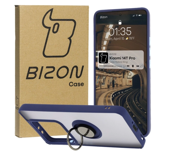 Etui Bizon z uchwytem na palec Hybrid Ring do Xiaomi 14T Pro przydymione z Granatową ramką