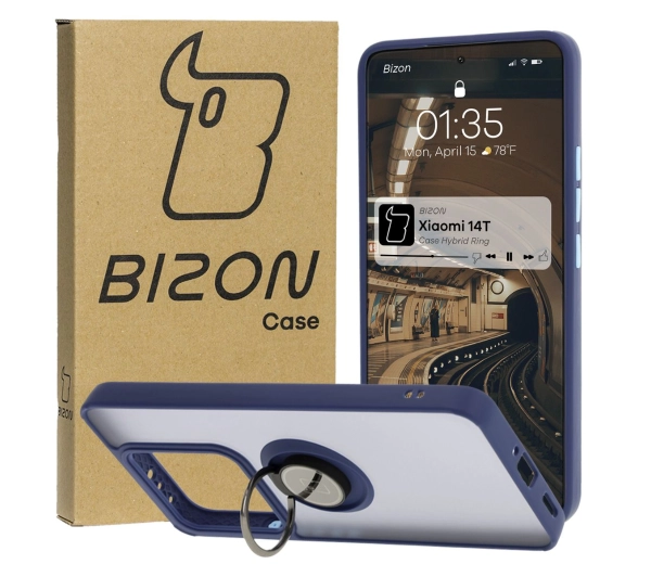 Etui Bizon z uchwytem na palec Hybrid Ring do Xiaomi 14T Przydymione z granatową ramką