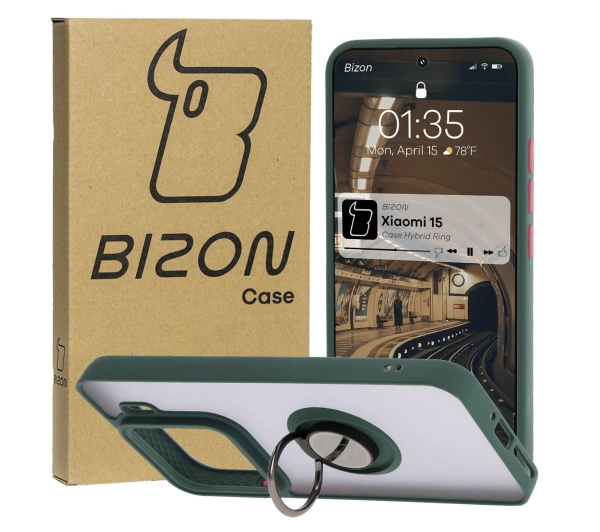 Etui Bizon z uchwytem na palec Hybrid Ring do Xiaomi 15 Przydymione z ciemnozieloną ramką