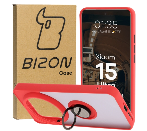 Etui Bizon z uchwytem na palec Hybrid Ring do Xiaomi 15 Ultra przydymione z Czerwoną ramką