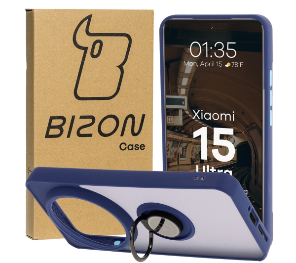 Etui Bizon z uchwytem na palec Hybrid Ring do Xiaomi 15 Ultra przydymione z Granatową ramką