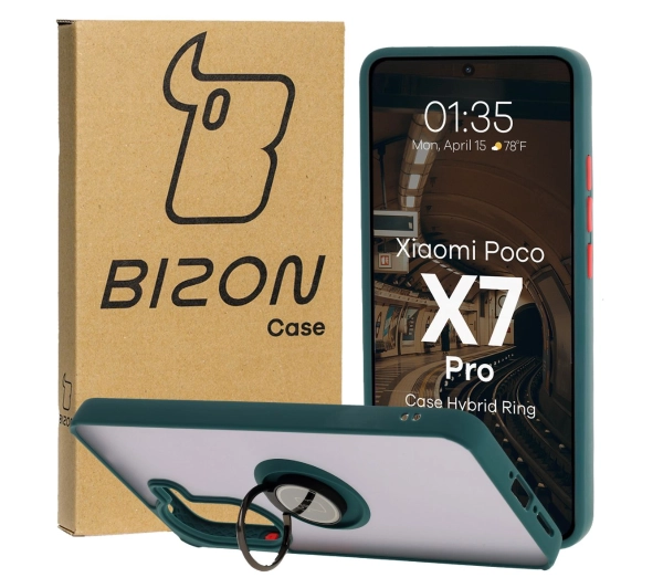 Etui Bizon z uchwytem na palec Hybrid Ring do Xiaomi Poco X7 Pro przydymione z Ciemnozieloną ramką