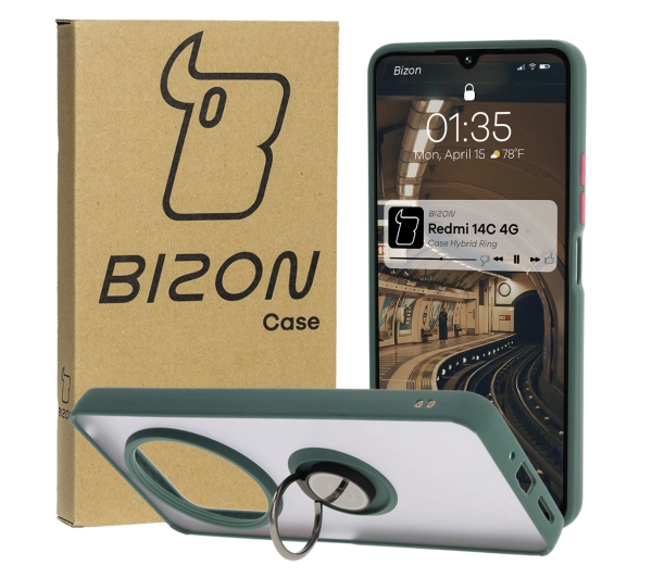 Etui Bizon z uchwytem na palec Hybrid Ring do Xiaomi Redmi 14C 4G/POCO C75 przydymione z Ciemnozieloną ramką
