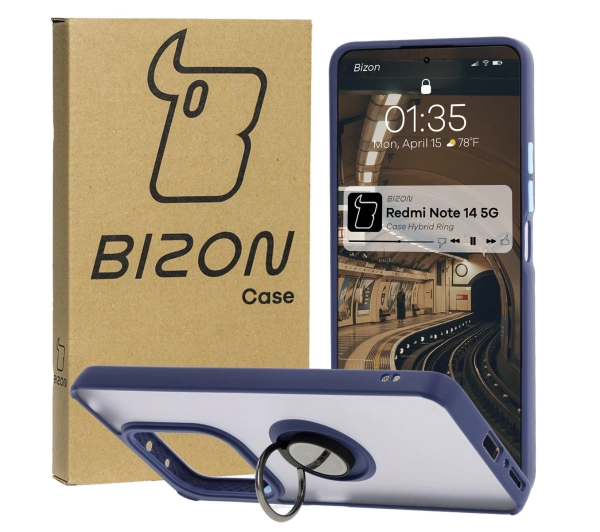 Etui Bizon z uchwytem na palec Hybrid Ring do Xiaomi Redmi Note 14 5G Przydymione z granatową ramką