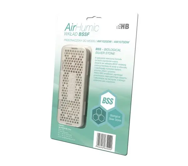<p>Filtr z jonami srebra do nawilżaczy powietrza HB AW1020DW i AW1070DW.BSS - Biological Silver Stone to specjalnie stworzona formuła na bazie cząsteczek srebra. Zawarte we wkładzie BSSF molekuły srebra przenikają do wody w zbiorniku i zapobiegają rozwojowi bakterii, wirusów, pleśni i grzybów.Wkład BSS dodatkowo zapobiega powstawaniu nieprzyjemnego zapachu i odbarwianiu się tworzywa, z którego wykonane jest urządzenie.</p>