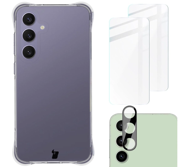 Zestaw ochronny Bizon elastyczne etui Salpa + 2x szkło hartowane + szkiełko na obiektyw Clear Pack do Galaxy S24 FE