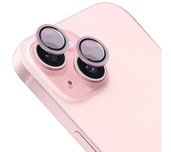 Szkło hartowane Bizon na aparat z aplikatorem Snap Lens do iPhone 15/15 Plus jasnoróżowa ramka