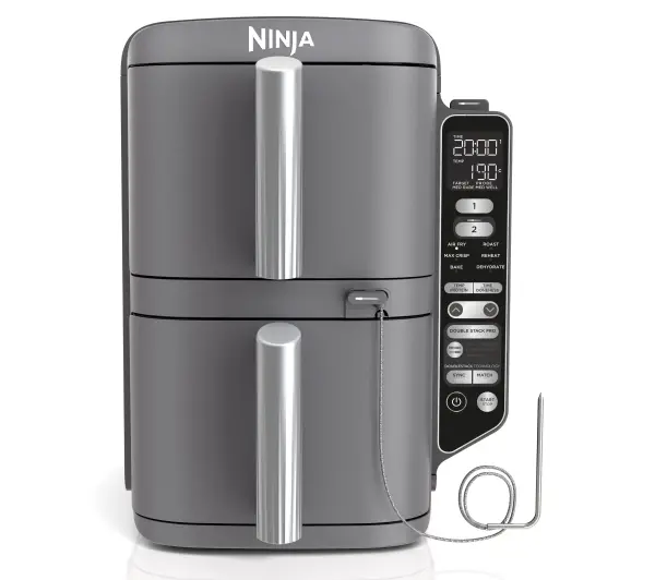Frytownica beztłuszczowa Ninja SL451EU ze zintegrowanym termometremGotuj szybciej, łatwiej i zdrowiej niż dotychczas z beztłuszczową frytownicą Ninja SL451EU wyposażoną w 2 szuflady o łącznej pojemności 9,5l oraz termometr. Dzięki umieszczeniu szuflad w pionie, jedna nad drugą frytownica jest o 30% węższa*, co pozwala na oszczędność miejsca w kuchni. Zamontuj 2 metalowe półki aby przygotować nawet 4 różne dania jednocześnie.*vs.Ninja AF400 Funkcja SYNCSynchronizuj czas gotowania w obu szufladach, tak aby posiłki w obu komorach były gotowe jednocześnie przy innych ustawieniach trybu.Tryb MATCHPowiel te same ustawienia w obu szufladach.6 trybów gotowaniaWśród nich pieczenie, Air Fry, ciasto lub odgrzewanie sprawdzą się przy szykowaniu posiłków dla całej rodziny.Termometr w zestawieZ łatwością skontrolujesz stopień wysmażenia potrawy.Pionowa konstrukcja – 30% węższa*Frytkownica beztłuszczowa Ninja SL451EU to doskonałe rozwiązanie dla osób, które chcą się cieszyć wygodnym gotowaniem dla całej rodziny, ale mają ograniczoną przestrzeń w kuchni. Szuflady umieszczone są jedna nad drugą – dlatego zajmuje mało miejsca na blacie. Jej wysokość wynosi natomiast 38,5 cm, co pozwala na swobodne ustawienie frytkownicy pod szafkami wiszącymi.*vs. NINJA AF400 Gotuj 4 różne potrawy w tym samym czasieDo każdej z 2 szuflad dołączona została półka dzieląca komorę na 2 piętra. Umożliwia to jednoczesne przygotowanie np. nuggetsów, frytek, pieczonych warzyw i ryby. Z frytownicą Ninja gotowanie staje się wyjątkowo proste. Skomponuj cały obiad w jednej frytownicy i zapomnij o stertach brudnych naczyń i pilnowaniu kilku dań na raz. 2 niezależnie sterowane szufladyKażda szuflada posiada niezależne sterowanie, możesz więc w każdej z nich ustawić inne parametry gotowania: tryb, temperaturę i czas pieczenia. A gdy potrzebujesz przygotować mniejszą porcję potrawy np. dla 1 osoby użyj tylko jednej z szuflad. Synchronizacja czasu gotowaniaChcesz w jednej szufladzie upiec frytki przez 15 minut, a w drugiej fragmenty kurczaka przez 25 minut? Nic prostszego, wciśnij przycisk SYNC, a Ninja SL451EU zsynchronizuje pracę w obu komorach, tak by oba dania były gotowe dokładnie w tym samym czasie! Te same ustawienia w obu szufladachAby przygotować większe porcje tego samego dania np. frytek i nie mieści się ono w 1 szufladzie, umieść je w obu komorach, wybierz czas, temperaturę i program gotowania dla jednej z komór, a następnie wciśnij przycisk MATCH – Ninja SL451EU automatycznie powieli te same ustawienia w drugiej strefie gotowania. Różne tryby gotowaniaZ 6 automatycznymi trybami pracy Ninja Double Stack XL SL451EU łatwo przygotujesz zróżnicowane potrawy na śniadanie, obiad, kolację czy deser. ZINTEGROWANY TERMOMETRUżyj dołączonego do zestawu inteligentnego termometru Foodi i wybierz odpowiednią funkcję, aby nie ryzykować, że twoje potrawy będą za mało wysmażone lub za suche. Z Termometrem Foodi twoje steki będą zawsze wysmażone tak jak lubisz, a kurczak doskonale dopieczony. I to wszystko bez ciągłego sprawdzania stopnia gotowości potrawy. Gotuj nawet do 55% szybciej niż w piekarnikach z termoobiegiem***Ta frytownica przygotowuje potrawy szybciej niż tradycyjny piekarnik. Już w kilka minut możesz podać ulubione dania całej rodziny. MNIEJ TŁUSZCZU Do 75%**** mniej tłuszczu niż w przypadku tradycyjnych metod smażenia.****Testowane na frytkach krojonych ręcznie, smażonych na głębokim tłuszczuDuża pojemność aż 9,5 lMasz dużą rodzinę? W takim razie frytkownica beztłuszczowa Ninja SL451EU będzie dla Ciebie najlepszym wyborem! Każda z szuflad wyróżnia się pojemnością 4,75 l, co łącznie daje aż 9,5 l miejsca na Twoje potrawy! Komora takiej wielkości z powodzeniem pomieści np. całego kurczaka o wadze ok. 1,5 kg lub kilka porcji frytek, co pomoże Ci w przyrządzaniu ulubionych dań dla Twoich bliskich. Łatwe czyszczenieWnętrze szuflad oraz płytki do zapiekania pokryte są nieprzywierającą powłoką, ułatwiającą czyszczenie i wraz z dodatkowymi metalowymi półkami nadają się do mycia w zmywarce, co ułatwia sprzątanie po gotowaniu. <h2>W opakowaniu</h2><ul> <li>Frytkownica beztłuszczowa Ninja SL451EU</li> <li>Frytkownica beztłuszczowa</li> <li>Ninja SL451EU</li> <li>Termometr</li> <li>2 kosze</li> <li>2 półki</li> <li>2 płytki do zapiekania</li> <li>Instrukcja obsługi w języku polskim</li> <li>Karta gwarancyjna</li></ul>Zainspiruj się przepisami NinjaSzukasz pomysłu na szybkie posiłki w ciągu tygodnia? A może czegoś specjalnego na przyjęcie? Nasze łatwe do wykonania przepisy pozwolą Ci tworzyć pyszne, zdrowe posiłki, przekąski i desery – bez względu na to czy jesteś wytrawnym kucharzem, czy dopiero zaczynasz przygodę z gotowaniem. Odwiedź https://www.przepisyninjakitchen.pl lub zeskanuj kod QR i ciesz się gotowaniem z Ninja.