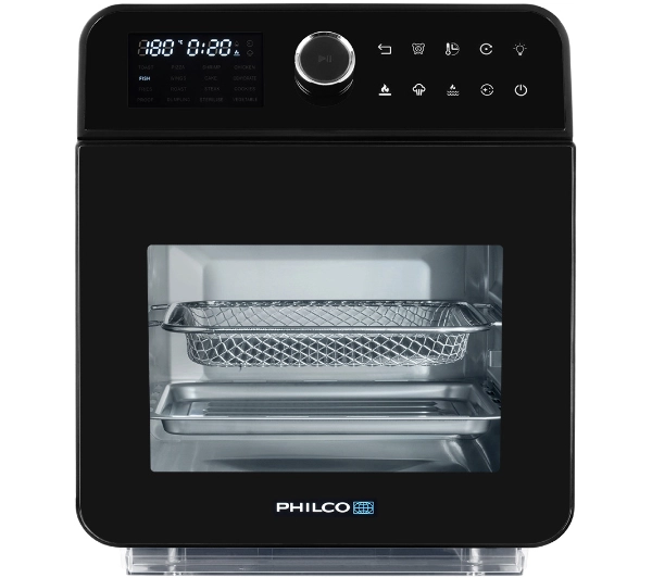 - Dodatkowe opcje: antypoślizgowe nóżki, kosz obrotowy , możliwość smażenia, opiekania, pieczenia, prażenia i grillowania, okienko do poglądu, podświetlenie wnętrza, timer, wskaźnik zasilania, wyświetlacz LCD