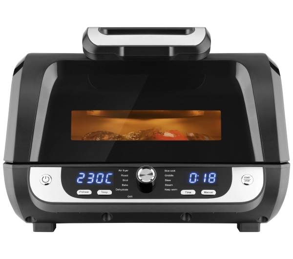 - Dodatkowe opcje: antypoślizgowe nóżki, automatyczne wyłączanie, możliwość smażenia, opiekania, pieczenia, prażenia i grillowania, okienko do poglądu, podświetlenie wnętrza, sygnał gotowości, sygnał końca pracy, timer, wyświetlacz LCD