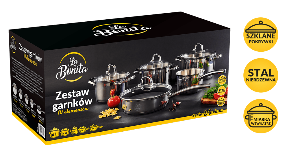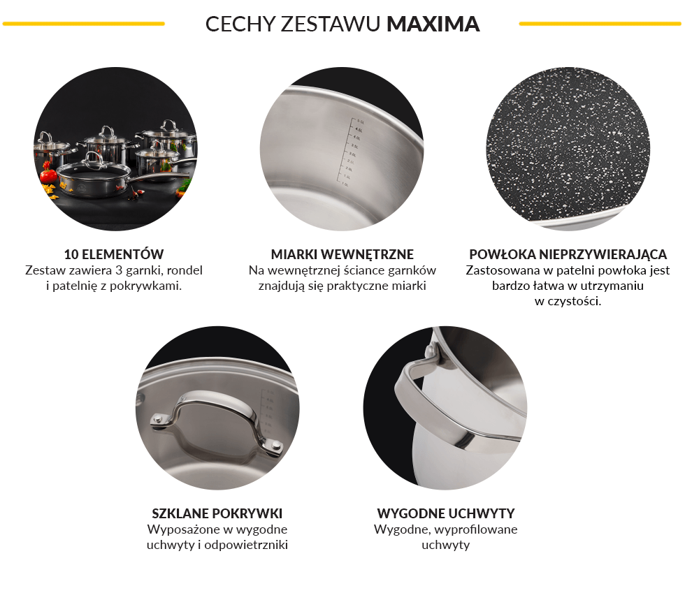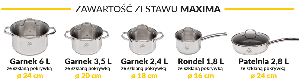 <p> </p> Zestaw garnków 10-elementowy MaximaZestaw garnków 10 elementowy Maxima to praktyczny zestaw do kuchni, składający się z 3 garnków, rondla i patelni z pokrywkami. Naczynia zostały wykonane z wysokiej jakości stali nierdzewnej .Dno naczyń ma strukturę kapsułową i zostało wzmocnione o kolejne sprasowane warstwy stalowe i aluminiowe. Dno patelni jest pokryte powłoką nieprzywierającą marki „Xylan-Whitford”.Idealnie gładka powierzchnia garnków ze stali uniemożliwia rozwój mikroorganizmów, nie wchodzi w interakcje z jedzeniem i jest odporna na działanie wysokich temperatur.Nowoczesny prosty kształt, przezroczyste pokrywy z odpowietrzaczem oraz miarki wewnątrz naczyń to cechy, które nadają zestawowi niezwykle użytecznych właściwości i doskonale sprawdzą się w każdej kuchni.<p> </p> <p>• Nowoczesny, prosty kształt garnków, doskonałe materiały, solidność i precyzja wykonania to główne zalety naczyń z linii Maxima.• 5 warstwowa powłoka dna powoduje szybkie i równomierne nagrzewanie i utrzymanie temperatury. Przyśpiesza to gotowanie, pozwalając zaoszczędzić czas, a tym samym zużycie gazu czy energii elektrycznej.• Garnki wykonane są ze stali nierdzewnej 18/10 wypolerowanej na wysoki połysk, dzięki której są odporne na wysokie temperatury, zarysowania, oraz nadają się do mycia w zmywarce.• Wewnętrzna miarka w garnkach umożliwia dokładne odmierzanie dodawanych składników.• Pokrywki ze szkła hartowanego zapewniają doskonałe dopasowanie do krawędzi naczynia oraz umożliwiają wgląd do potraw na każdym etapie gotowania. Ciepło oraz woda ze składnikami odżywczymi są zatrzymywane wewnątrz garnka. Odpowietrzniki regulują poziom pary wodnej, co wpływa na polepszenie jakości gotowania.• Duże i wygodne uchwyty zostały zaprojektowane tak, aby zagwarantować jak największy komfort podczas mieszania potraw i dźwigania ciężkiego naczynia. • Garnki nadają się do wszystkich rodzajów kuchenek, w tym również indukcyjnych.</p>