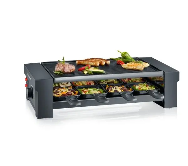 Raclette przygotowuje się na małych patelniach dołączonych do zestawu. Każdy może przygotować potrawę ze swoich ulubionych składników, dlatego to idealne rozwiązanie na spotkania towarzyskie.