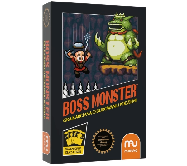 Opis: Boss Monster to samodzielna gra karciana, która rzuca graczy w wir niezwykłych przygód. Mają zmienić się w złoczyńców rodem z gier wideo i zbudować zabójcze podziemia. Gracze rywalizują starając się zwabić i zniszczyć jak największą liczbę poszukiwaczy przygód. Ale uwaga! Muszą stworzyć podziemia tyleż atrakcyjne, co śmiercionośne, inaczej słabowici bohaterowie gotowi ich pozabijać!