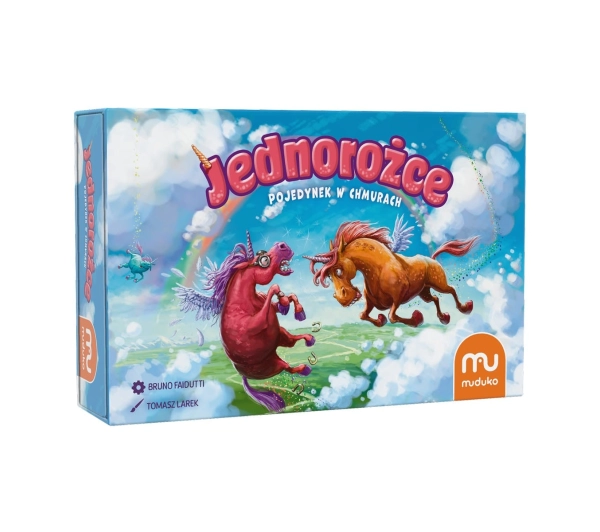 Opis: Jednorożce. Pojedynek w chmurach to dwuosobowa gra taktyczna, w której jednorożce skaczą po chmurkach i zostawiają za sobą tęczę. Co ważne, poruszają się w charakterystyczny sposób - ruchem skoczka, czyli jednej z figur szachowych. Jeśli jeden z graczy nie będzie mógł wykonać ruchu drugi gracz wygrywa.