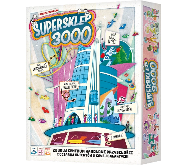 Opis: W dynamicznej grze strategicznej Supersklep 3000 wcielisz się w jednego z rywalizujących inżynierów, którzy chcą zbudować najbardziej wyjątkowe centrum handlowe wszech czasów. Musisz stworzyć taką kombinację sklepów i atrakcji, aby zadowolić najbardziej wymagających klientów.