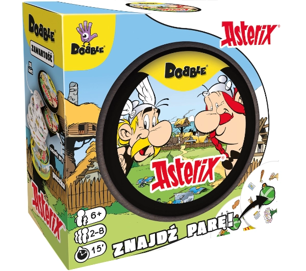 Opis: Asteriks, Obeliks, Panoramiks i inni mieszkańcy wioski szykują się do obrony przed Rzymianami! Zebrali najważniejsze rzeczy, a po drodze zawitali na karty Dobble, by cieszyć najmłodszych i zachęcać ich do rozwijania refleksu i spostrzegawczości. Spójrz na pierwszą kartę, którą trzymasz w ręku oraz na tę, która leży na środku stołu. Znajdź na nich wspólny symbol, nazwij go i szybko pozbądź się swojej karty. Teraz następna! Tylko nie zwątp, dwie dowolne karty zawsze łączy jeden wspólny obrazek.