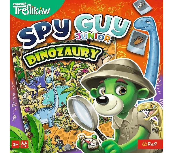 Opis: Spy Guy Junior Dinozaury to kooperacyjna gra, w której wcielacie się w rolę młodego detektywa. Spróbujcie schwytać złoczyńcę, nim ten ucieknie z parku dinozaurów z niezwykle rzadkim jajem brachiozaura. Ćwiczcie spostrzegawczość, umiejętność skupienia uwagi i współpracy, poszukując poszlak na barwnej, rysunkowej ponadmetrowej planszy. Wersja Junior dedykowana jest młodszym graczom, dlatego, aby ułatwić poszukiwania, ilustracje są większe, a plansza mniej szczegółowa.