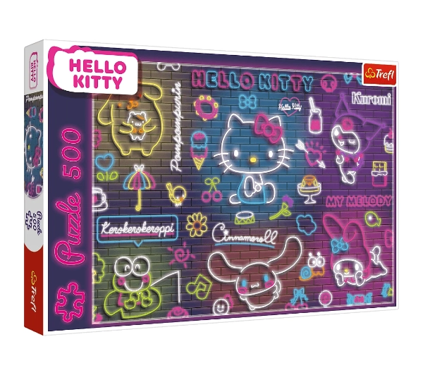 Opis: Puzzle Neon Hello Kitty składają się z 500 elementów i po ułożeniu stworzą neonowy obrazek, nawiązujący do bajki Hello Kitty. Gotowa układanka ma wymiary 480x340 mm.