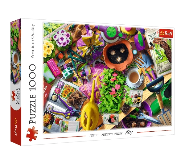 Opis: Puzzle Porządki w ogrodzie, składające się z 1000 elementów, przedstawiają barwny obrazek, który zachwyci nie tylko ogrodników. Po ich ułożeniu powstanie obrazek w rozmiarach 683x480 mm.