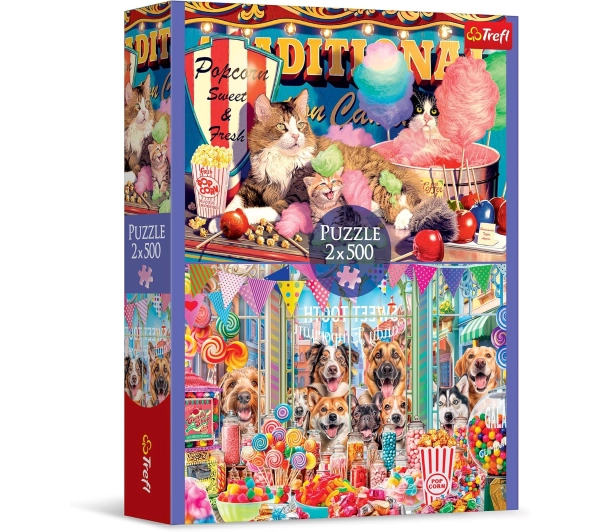 Opis: Puzzle 2x500 to aż dwie układanki 500 elementów w jednym opakowaniu! Puszyści przyjaciele to puzzle przedstawiające słodkie spojrzenie na psy i koty. Każda z układanek pozwoli stworzyć obrazek o wymiarach 480x340 mm.