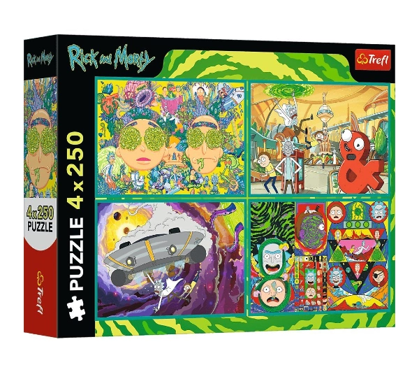 Opis: Puzzle 4x250 to aż cztery układanki 250 elementów w jednym opakowaniu! Zakręcony świat Ricka i Morty'ego to puzzle przedstawiające bohaterów popularnego serialu animowanego Rick i Morty. Każda z układanek pozwoli stworzyć obrazek o wymiarach 339x238 mm.