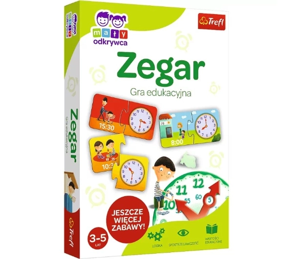 Opis: Zegar to układanka edukacyjna, która w przyjazny sposób uczy określania godzin w formacie analogowym i cyfrowym oraz przyporządkowywania różnych czynności odpowiednim porom dnia. W grze zastosowano rysunki przedstawiające typowy dzień przedszkolaka (tj. znane dzieciom czynności), co znacznie ułatwia naukę. Układanka rozwija zdolność planowania i określania kolejności zdarzeń.