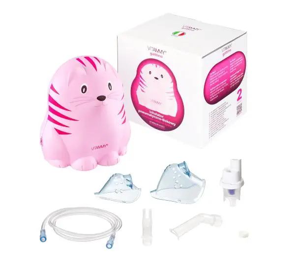 Wyposażenie: instrukcja obsługi, karta gwarancyjna, maska dla dorosłych, maska dla dzieci, pojemnik do nebulizacji, przewód powietrza, ustnik, zapasowe filtry