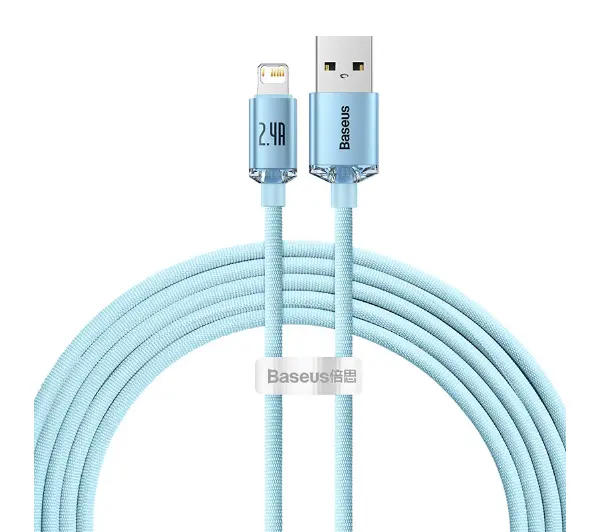 <h2>Kabel USB-C do iP Baseus Crystal Shine, 2.4A, 2m (niebieski)</h2><p>Kabel Baseus Crystal Shine umożliwia ładowanie urządzeń z wykorzystaniem technologii szybkiego ładowania o natężeniu 2.4 A i pozwala na transfer danych z prędkością do 480 Mbps. Produkt przeszedł szereg testów wytrzymałościowych, które potwierdziły jego wysoką jakość wykonania.</p> <h2>Ładowanie i transfer danych</h2><p>Wykorzystanie natężenia 2.4 A umożliwiło szybkie odnawianie energii urządzeń Apple. Kabel zapewnia również możliwość równoczesnego ładowania urządzenia i przesyłania danych z prędkością 480 Mbps.</p> <h2>Trwała, przemyślana konstrukcja</h2><p>Akcesorium zostało wykonane z wysokiej jakości tworzywa i wykończone zostało stopem aluminium, co zapobiega plątaniu się i zwiększa odporność na uszkodzenia. Stałe połączenie w porcie zapewnia stabilne ładowanie, a zastosowanie rdzenia z miedzi przyczynia się do szybszego ładowania oraz lepszego przewodnictwa. Wbudowany inteligentny chip kontroluje temperaturę, zabezpieczając urządzenie przed przegrzaniem.</p>