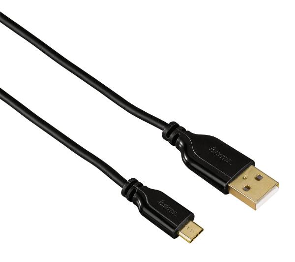 Kabel Hama USB A - microUSB B 180° "FLEXI-SLIM" 0,75m<ul> <li>Wysoka szybkość transferu danych do 480 Mbps</li> <li>Pozłacana wtyczka o niskiej rezystancji przejściowej zapewniająca niezawodną transmisję sygnałów</li> <li>Lekki i oszczędny dzięki zastosowaniu spiralnego kabla oraz bardzo małych wtyków</li> <li>Cienki profil pozwala na zastosowania do urządzeń mobilnych, jak smartphony, tablety oraz kamery</li> <li>Bez uciążliwych prób podłączenia: wtyczka daje się włożyć bez obracania i odwracania</li> <li>Miedziany przewód wewnętrzny zapewniający optymalny transfer danych</li></ul>
