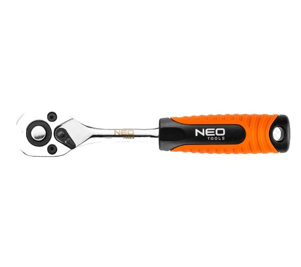 Grzechotka NEO, z korpusem ze stali chromowo-wanadowej, wykonana zgodnie z normą DIN 3122. 45-zębowy mechanizm zapadkowy wykonany jest z wyjątkowo trwałej stali chromowo-molibdenowej, przedłużającej żywotność narzędzia. Ergonomiczny uchwyt dwumateriałowy poprawia komfort pracy. Jakość narzędzia potwierdzona certyfikatem TÜV i 25-letnią gwarancją producenta. Marka NEO spełnia oczekiwania profesjonalistów.Grzechotka, korpus ze stali CrV, mechanizm zapadkowy ze stali CrMo, 45 zębów, przełącznik kierunku obrotów, system blokowania i zwalniania nasadki, dwumateriałowy uchwyt, DIN3122, certyfikat TÜV M+T, 25 lat gwarancji3/8" 210 mm