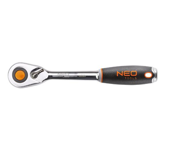 Grzechotka 1/2" NEO o długości 245 mm, z korpusem ze stali chromowo-wanadowej, wykonana zgodnie z normą DIN 3122. 48-zębowy mechanizm zapadkowy wykonany jest z wyjątkowo trwałej stali chromowo-molibdenowej, przedłużającej żywotność narzędzia. Ergonomiczny uchwyt dwumateriałowy poprawia komfort pracy. Jakość narzędzia potwierdzona certyfikatem TÜV i 25-letnią gwarancją producenta. Marka NEO spełnia oczekiwania profesjonalistów.Grzechotka 1/2, 245 mm, korpus ze stali CrV, mechanizm zapadkowy ze stali CrMo, 48 zębów, przełącznik kierunku obrotów, system blokowania i zwalniania nasadki, dwumateriałowy uchwyt, DIN3122