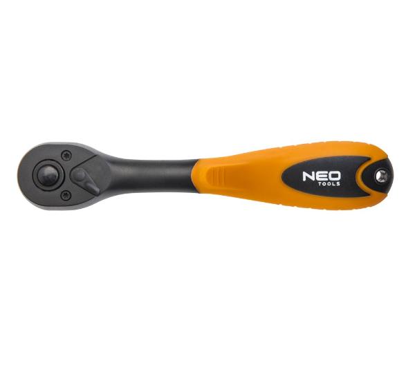 Grzechotka odgięta 3/8" NEO o długości 200 mm, wykonana zgodnie z normą DIN 3122. Korpus grzechotki z kompozytu o wysokiej wytrzymałości. 72-zębowy mechanizm zapadkowy umożliwia precyzyjną pracę, wykonany jest z wyjątkowo trwałej stali chromowo-molibdenowej, przedłużającej żywotność narzędzia. Ergonomiczny, dwumateriałowy uchwyt poprawia komfort pracy. Jakość narzędzia potwierdzona certyfikatem TÜV i 25-letnią gwarancją producenta. Marka NEO spełnia oczekiwania profesjonalistów.Grzechotka odgięta 3/8, 200 mm, korpus z kompozytu PP, mechanizm zapadkowy ze stali CrMo, 72 zęby, przełącznik kierunku obrotów, system blokowania i zwalniania nasadki, dwumateriałowy uchwyt, DIN3122